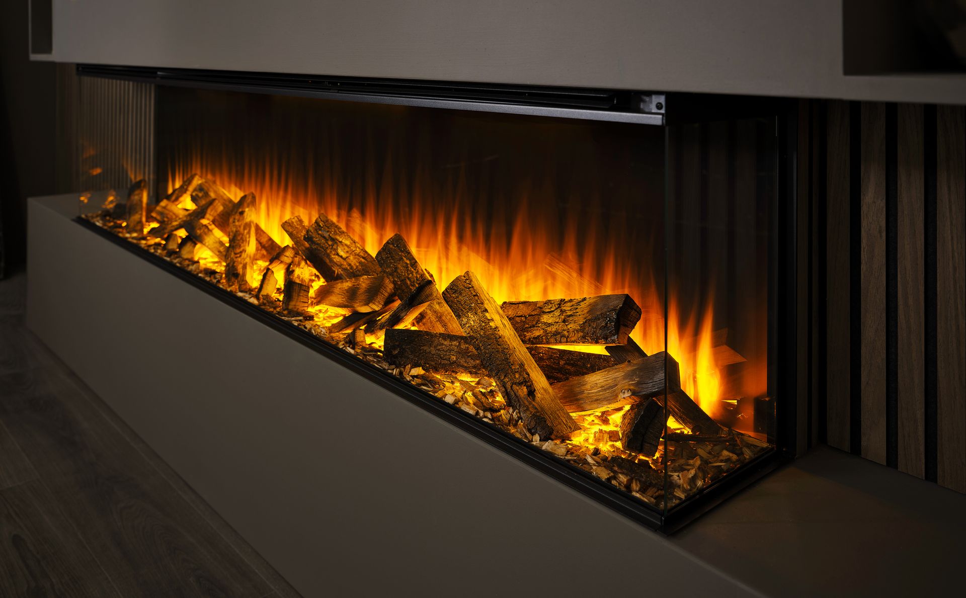 From the outset, the Black Edition is built to impress. Each model features a dark-tinted rear glass panel which suppresses unwanted reflections and amplifies the flame visuals, giving you a deeper, richer view. Paired with our hand-finished Deluxe Real Logs, every detail is engineered to show off. Our logs are responsibly sourced UK oak, scorched and arranged over bark and twigs for genuine texture.